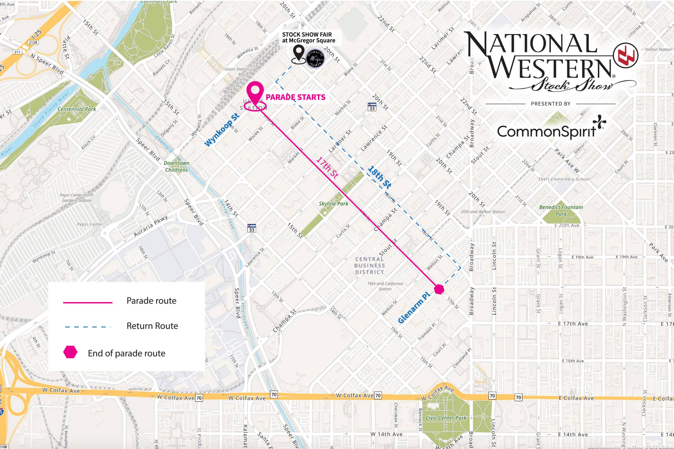 Please be aware and cognizant of the returning parade entries along 18th Street to Wynkoop. Vehicles should keep a safe distance from horses and riders as they return to the parade staging area. The safety of patrons, animals, and riders is of the utmost importance.