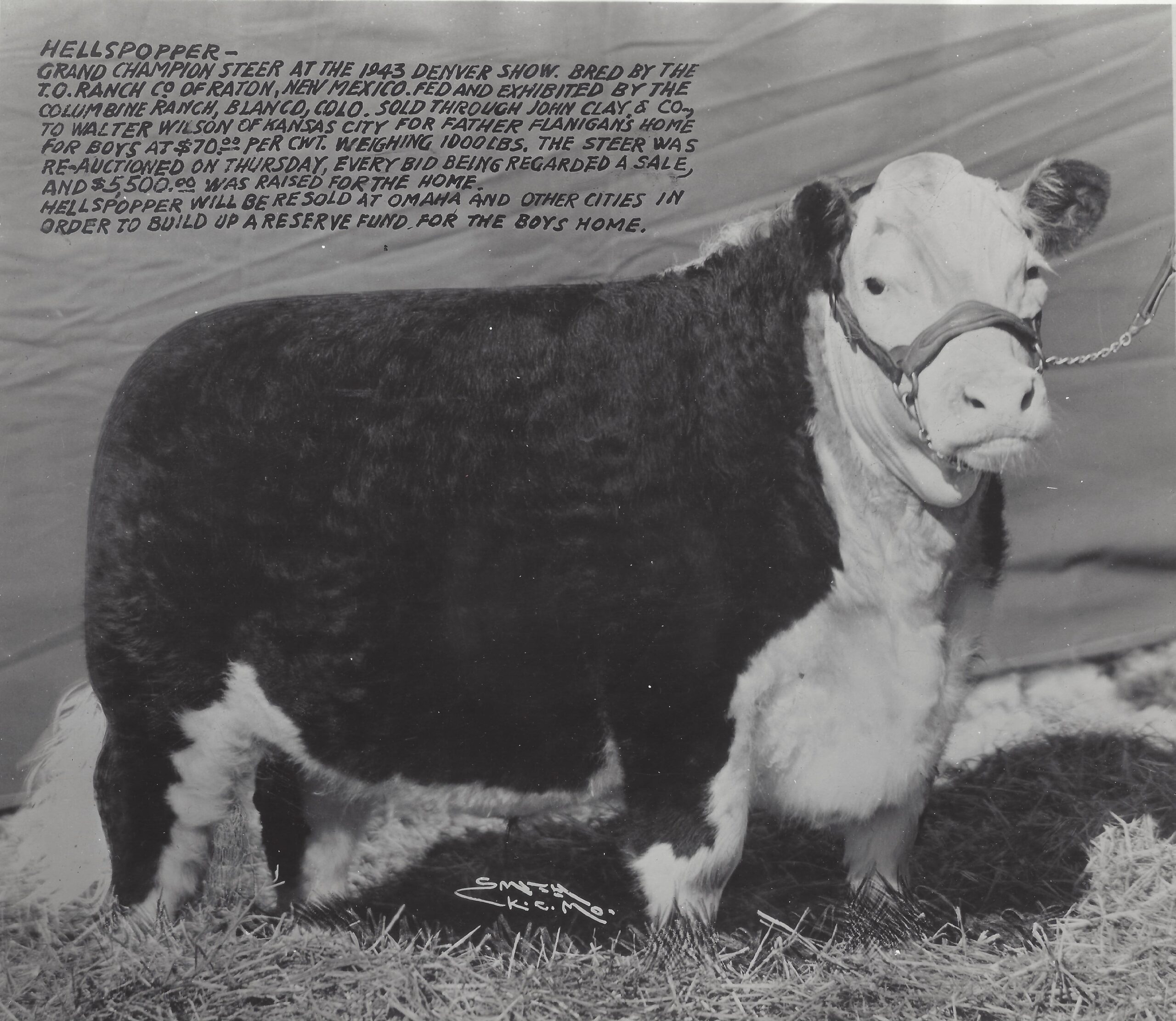 In 1943, Hellspopper was the Grand Champion Steer of the show. He was sold traditionally, but then things changed. He was resold, and resold, and resold in Denver and elsewhere in the country, each time raising more and more money for Father Flanigan’s Home for Boys in Nebraska.