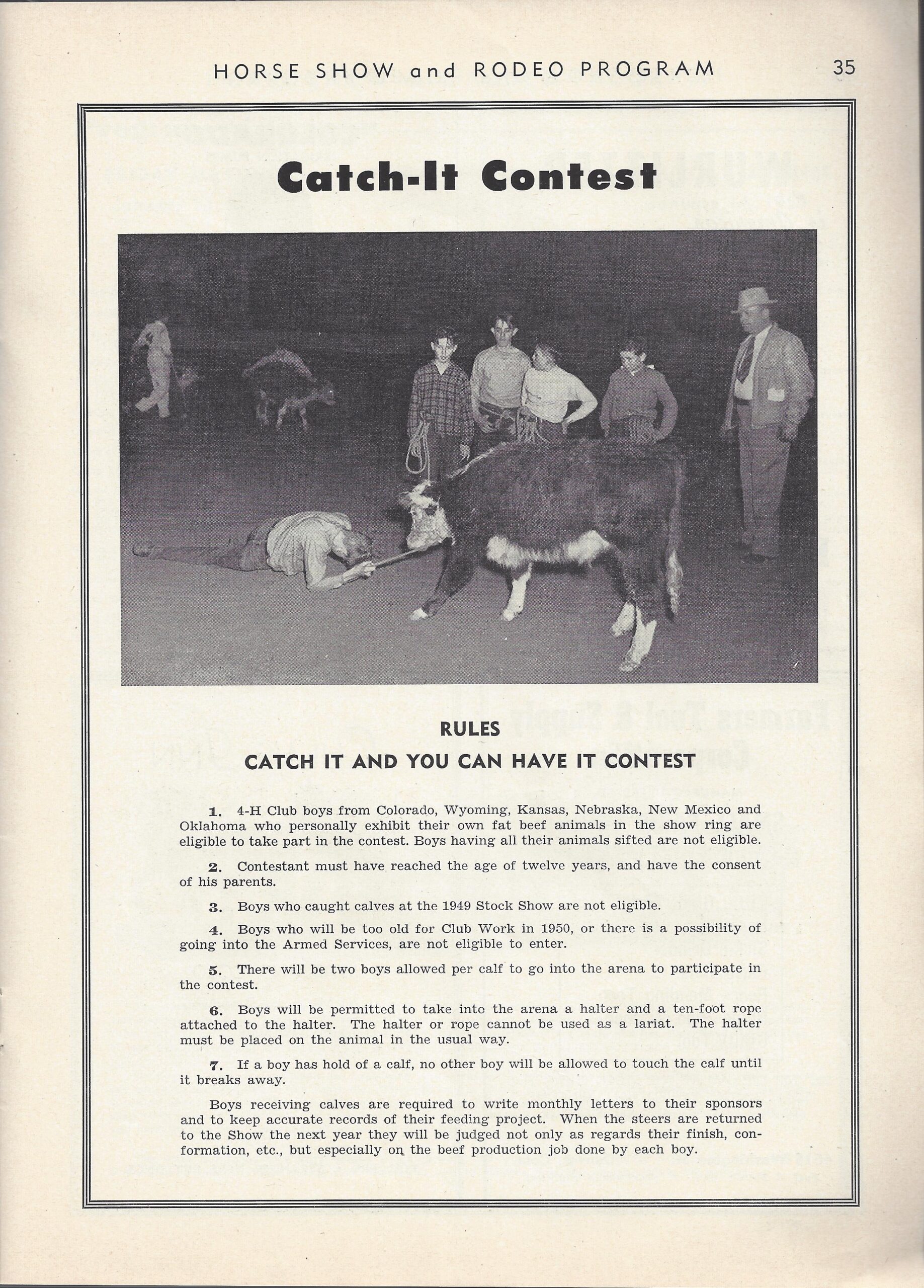 In 1935, the Catch-It-Calf program began with 4-H boys completing. Now known as Catch-A-Calf, it is one of the more popular events at the rodeo and livestock show. In 1974 girls began completing in the program.