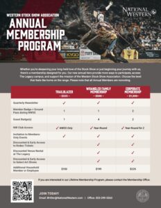About Membership: Membership in the Western Stock Show Association is open to any individual or entity interested in the educational purposes of the Association in the fields of livestock and agriculture. Association members are encouraged to participate at the Annual Meeting of the Members held each May and special membership meetings held throughout the year. Member support of and at the National Western Stock Show each January is encouraged and appreciated.